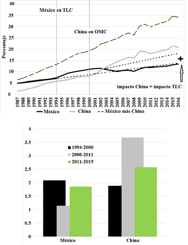 El segundo periodo puede dividirse también en tres sub-periodos, el de apertura comercial y estabilización que termina con la crisis del Tequila, el periodo post-TLC pero pre-entrada de China a la OMC y el periodo TLC post-China. Los rasgos mas notables son: (i) el boom de apalancamiento externo y colapso radical de la respuesta domestica que siguieron a la apertura comercial de fines de los ochenta en el contexto de estabilización cambiaria pre-Tequila; (ii) el boom de exportaciones que siguió a la entrada de México al TLC y su posterior colapso tras la entrada de China a la OMC y (iii) la recuperación del apalancamiento externo en el periodo TLC post-China tras la caída de las exportaciones.