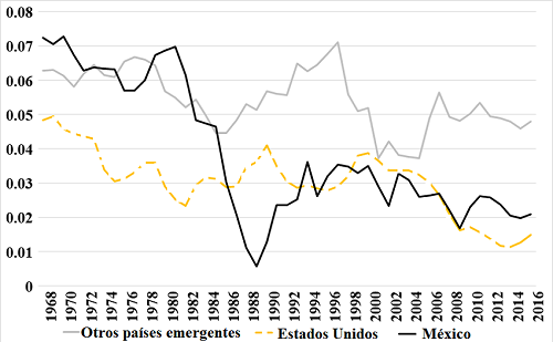 México experimentó un desplome en su respuesta doméstica frente a la liberalización comercial de fines de los ochenta (Gráfica 10) muy similar al que habían enfrentado los otros países emergentes y Estados Unidos una década antes frente al comienzo del proceso de globalización. En el caso de México, sin embargo, la magnitud del desplome fue mucho mayor. Comparado con Estados Unidos, esta menor magnitud probablemente pueda explicarse, en buena medida, por el tamaño muy menor de la economía mexicana. Comparado con los otros países emergentes, probablemente se explique por la mayor radicalidad de la apertura comercial de México a partir de una economía inicialmente mucho más cerrada y más orientada hacia adentro, vía el proceso de sustitución de importaciones.