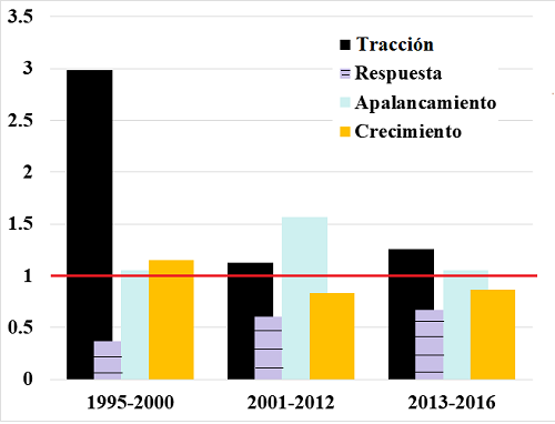 Los cuatro términos de esta nueva identidad aparecen en la Gráfica 9. El crecimiento de México ha seguido de cerca al de Estados Unidos durante el periodo post-TLC (la elasticidad del crecimiento de México en relación con el de Estados Unidos se mantuvo cercana a uno) porqué el efecto tracción durante 1995-2000 y el apalancamiento durante 2001-2012 compensaron la escasa respuesta de la economía mexicana durante ambos periodos. Esto apunta por lo tanto nuevamente hacia la importancia de identificar las posibles razones que permitan explicar esta baja respuesta.