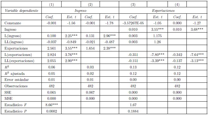 El segundo término mide que tanto crecen las importaciones del país dadas sus exportaciones. Si el país no usa recursos externos mantendrá el crecimiento de sus importaciones igual al crecimiento de sus exportaciones a manera de mantener el equilibrio de su balanza de pagos; en cuyo caso, este término también valdrá uno. Sin embargo, un país puede escoger aumentar más sus importaciones que sus exportaciones, “apalancando” su crecimiento con recursos externos (deuda, inversión extranjera directa, remesas, etc.).8 En consecuencia, el segundo término se define como el efecto apalancamiento externo.