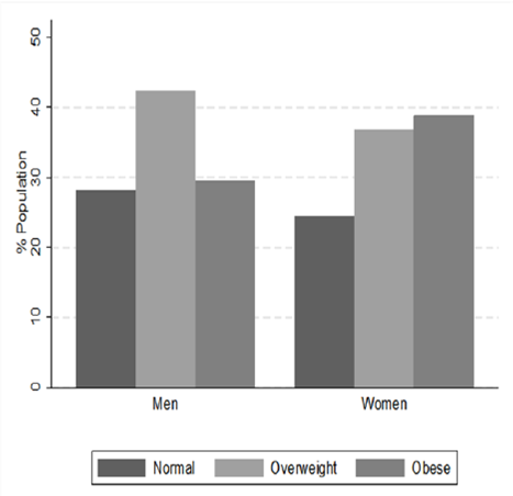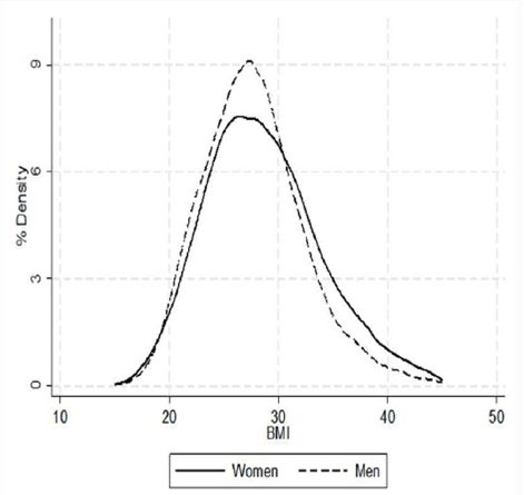 Figure 1 shows the distribution of BMI for men and women according to the ENSANUT 2012. It can be seen that the distribution of women is slightly skewed to the right. Although not shown, women's rates of obesity have increased more than those of men (Barquera et al., 2010), as discussed in the Introduction.