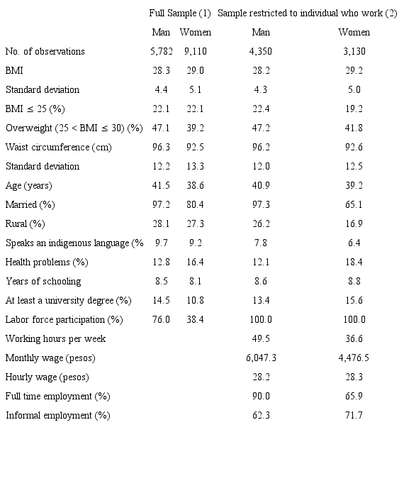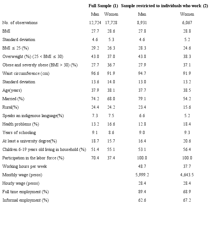 Mexico has the second highest rate of obesity in the world (32.4%), exceeded only by the United States, and it is the country with the highest obesity rate for women (37.5%). Although there are many studies analyzing the relationship between obesity and labor market outcomes, an examination of Mexico is of particular importance for three reasons. First, Mexico offers a large variation in body mass index, with 27.5% of individuals in the normal range, 39.6% overweight, and 32.8% obese. Second, Mexico has a health survey including exact measurements of height, weight, and waist circumference, along with labor market outcomes. Third, previous estimates are mainly for developed countries with effective institutions for sanctioning discrimination.