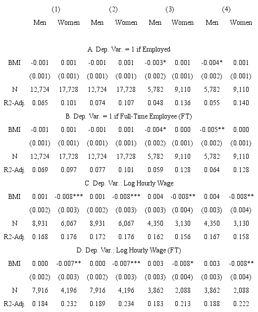 We find two sets of important results. First, BMI has no relationship with men's decision to work whereas, it has a small and positive effect on women. Second, increased BMI affects women's wages but not that of men. Using an instrumental variable approach, we find that an increase in the BMI of one standard deviation lowers women's wages by 16%. This effect is substantial, equivalent to a decrease of 2.5 years in schooling. The effects we find are similar to, but greater than, those found for white women in the United States (Cawley, 2004; Sabia and Rees, 2012), and much larger than estimates for European countries (Brunello and d'Hombres, 2007; Garcia and Quintana-Domeque, 2006). Finally, our results are highly robust to the sample used, as well as with control variables for depression and cognitive skills. A key question for future research is whether differences across countries in the extent of wage penalties due to obesity are driven by institutional capacities to prevent discrimination.