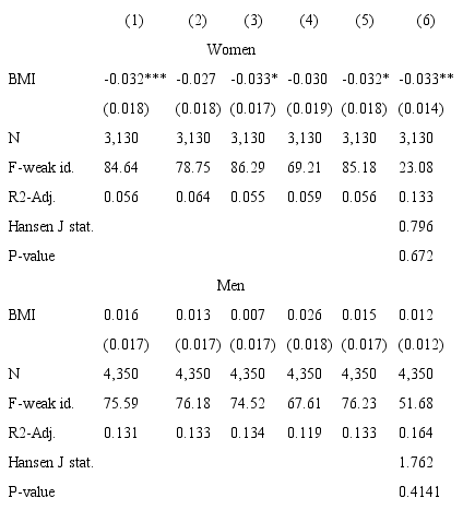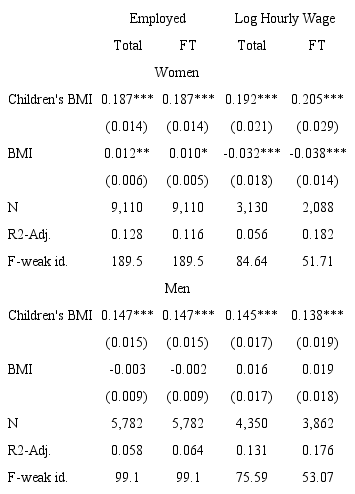 The negative effects remain very close to those of the main regression (2.7%, 3.3%, and 3%, respectively). In other words, a one-unit increase in the BMI, was associated with a 2.7%, 3.3% and 3% decline in hourly wage for women. In all cases, F tests allow us to reject the null hypothesis of weak instruments. However, the result is only significant when we use the BMI of the eldest child.27