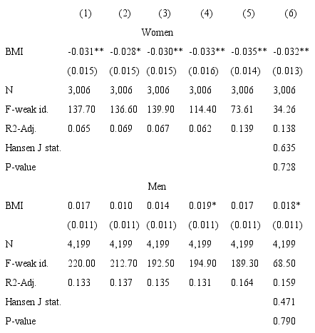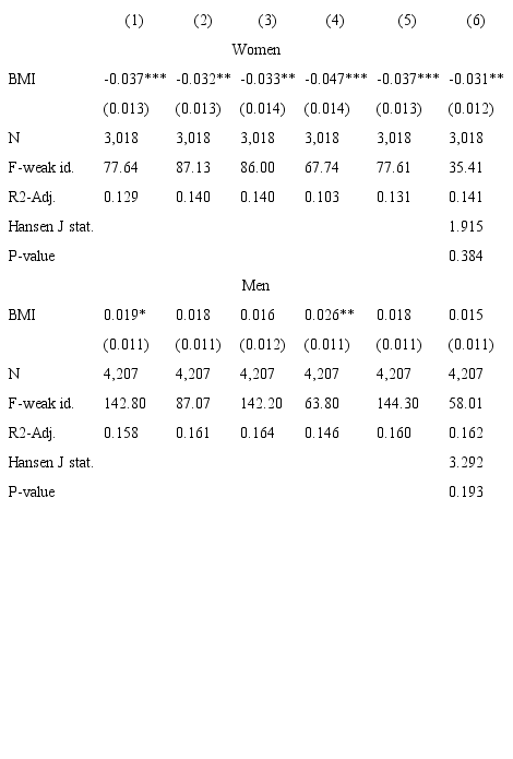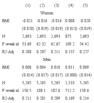 Table 5, column 1, shows the same regression as Table 4. This estimate is obtained using the average BMI of individuals' own children as an instrument. We test whether this result is driven by the BMI of one child in particular. A priori, we would expect that if the instrument is valid, i.e., that the BMI of any of the children is related to the BMI of their parents but without unobservable factors, there should be no difference with respect to which child's BMI is used. Columns 2, 3, and 4 use, respectively, the highest BMI among them, the BMI of the eldest child aged 6-19, and the BMI of the youngest of the group as instruments.