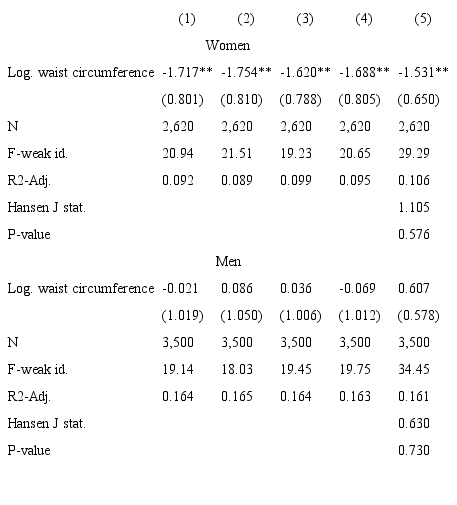 Averett (2014) notes that waist circumference is a measure of central obesity. It has the key advantage over BMI that it is a stronger predictor of mortality and morbidity. In addition, it is a good measure of visible fatness, which may lead to discrimination. The ENSANUT includes exact measurement of waist circumference: the average for women is 91.9 cm, with a standard deviation of 13.2 (Table 1). Table 7 is analogous to Table 6 but uses the log of waist circumference in-stead of BMI on the log of hourly wages.31 Column 1 uses the log of children's waist circumference as an instrument. As in previous tables, the only statistically significant effects are for women. Columns 2-5 use the largest waist circumference among the children, the waist circumference of the eldest child, the main instrument (column 1) with the depression variable as a control, and the main instrument with its second- and third-degree polynomials.32 The results are con-sistent with those shown in Table 5. There is a negative effect of BMI or waist circumference on women's wages but not on men's wages. An increase of one standard deviation in waist circumference reduces women's wages by 24%, which is larger than the effect of a one standard deviation increase in BMI.