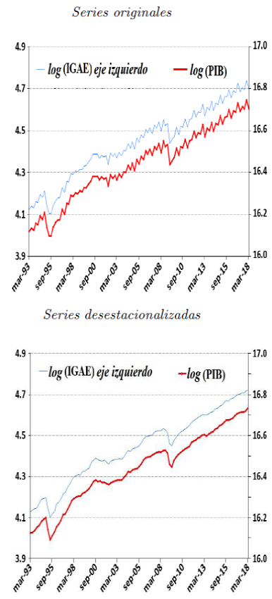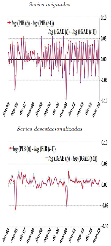 En las estimaciones del logaritmo del PIB mensual que se obtendrán en este estudio se utilizan las series de tiempo del PIB trimestral a precios constantes y del IGAE mensual, ambas series con datos originales y desestacionalizados para el periodo de marzo de 1993 a marzo de 2018. Los datos se obtuvieron del INEGI.