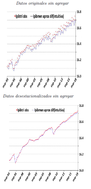 La aproximación intuitiva consiste en construir el logaritmo del PIB mensual utilizando la tasa de crecimiento del IGAE mensual observado sin considerar ningún estimador o modelo estadístico. En otras palabras, se toma simplemente a la tasa de crecimiento del PIB mensual, tanto para los datos agregados y sin agregar, como: