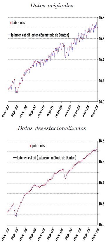 La grafica 4 presenta la trayectoria mensual del logaritmo del PIB interpolado por la extensión del método de Denton, junto con los datos trimestrales observados de los logaritmos del PIB para la serie original y desestacionalizada. La ventaja de este método con respecto a la aproximación intuitiva es que se obtiene una estimación mensual del logaritmo del PIB cuyo dato trimestral coincide exactamente con el logaritmo del PIB trimestral observado, el único inconveniente es que dicha estimación mensual considera que los datos inter-trimestrales tienen el mismo peso, lo cual puede no ser cierto en la realidad. Además, igual que la aproximación intuitiva, solo se pueden realizar estimaciones dentro de muestra, ya que es necesario conocer el dato del IGAE y del PIB para hacer la estimación intertrimestral del PIB mensual, asó que, en este caso, tampoco se puede conocer el logaritmo del PIB mensual en tiempo real, es decir, la última estimación tiene un rezago de cinco meses con respecto al mes de la publicación. Sin embargo, dado su propiedad de que al final del trimestre coinciden con el PIB trimestral, este modelo puede ser utilizado como un modelo base.