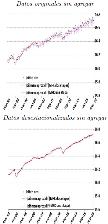 Además, para verificar que tipo de datos, agregados o sin agregar, genera un mejor ajuste fuera de muestra se hace una comparación mensual de las estimaciones del logaritmo del PIB con las aproximaciones obtenidas mediante la extensión del método de Denton y el modelo MFK una etapa dentro de muestra, así como una comparación trimestral con los datos observados del logaritmo del PIB, teniendo siempre en mente que esta última es el único parámetro real de comparación con que se cuenta.