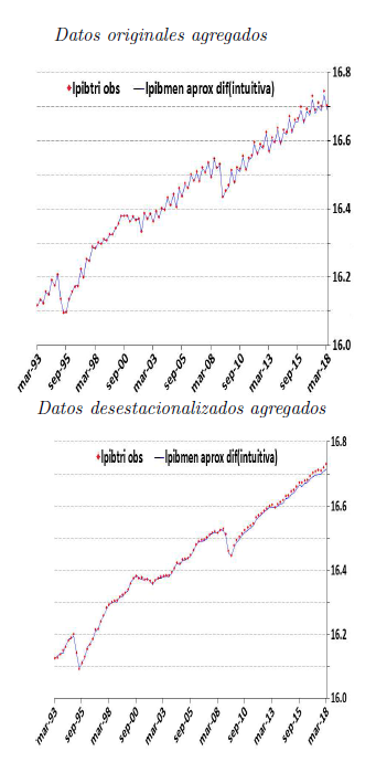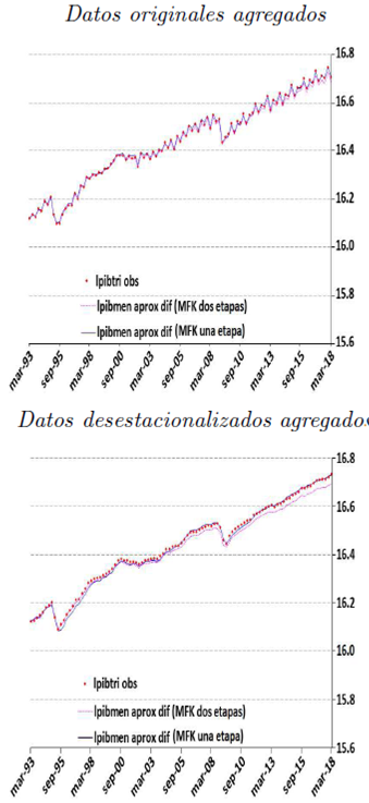 Sin embargo, la aproximación hecha con los datos desestacionalizados sin agregar parece jugar un mejor papel en el ajuste con los datos observados trimestrales, que la aproximación realizada con los datos desestacionalizados agregados. El único inconveniente es que solo se pueden hacer estimaciones dentro de muestra, ya que el dato del IGAE siempre es requerido para hacer una nueva aproximación del PIB mensual, por lo que también se tiene un rezago de dos meses para conocer la estimación en tiempo real del logaritmo del PIB mensual.