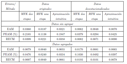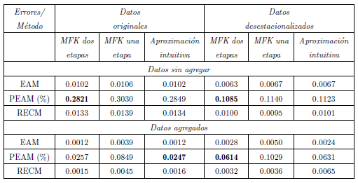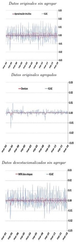 En el cuadro 3 se observa que no hay un método que en todos los casos proporcione la mejor aproximación. No obstante, el método de MFK dos etapas parece ser el que menores errores presenta para los datos sin agregar y para los datos desestacionalizados agregados. Además, para los datos originales agregados el que menores errores presenta es la aproximación intuitiva. Hay que destacar que, en este caso, tal vez se pudiera obtener una mejor aproximación si se hubiera considerado como variable de insumo a la tasa de crecimiento anual del IGAE en los diferentes métodos utilizados, en lugar de las tasas de crecimiento mensual y luego anualizar.