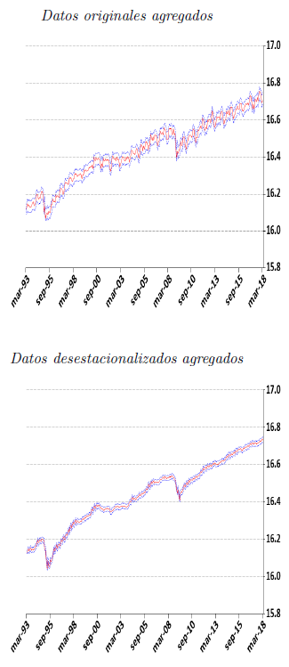 Los resultados con la aplicación de los dos métodos anteriores a las series originales y desestacionalizadas se presentan en la gráfica 5 para los datos sin agregar y en la 6 para los datos agregados.16 En ambas gráficas los rombos corresponden a los logaritmos del PIB trimestral observado, la línea punteada representa el logaritmo del PIB mensual aproximado mediante el método MFK dos etapas y la línea continua corresponde al logaritmo del PIB mensual aproximado a través del método MFK una etapa.