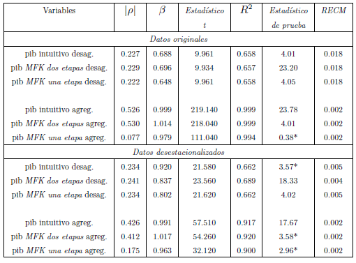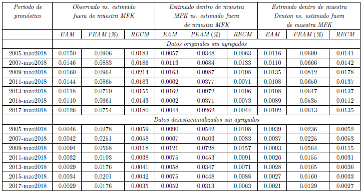 En el cuadro 2 se aprecia que el modelo que menores errores presenta al ajustar los datos trimestrales del PIB observado es el MFK una etapa para datos sin agregar, el PEAM de las estimaciones realizadas con dicho método resultan ser, en promedio, menores a 0.12% y 0.03% para datos originales y desestacionalizados, respectivamente. Para el caso de los datos agregados, el método MFK una etapa es mejor en el a juste con los datos originales y la aproximación intuitiva es mejor con los datos desestacionalizados, el PEAM correspondiente es menor a 0.03% y 0.04%, respectivamente.18