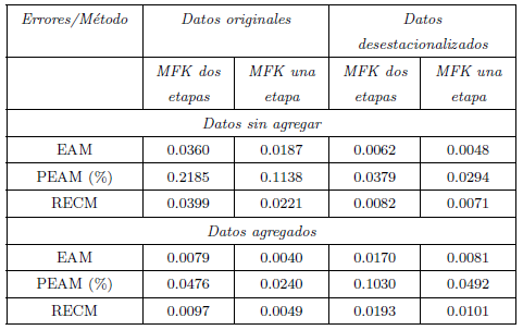 Para comparar el ajuste dentro de muestra de las estimaciones realizadas mediante los métodos MFK una etapa y MFK dos etapas, tanto para datos sin agregar como para los datos agregados, se calculan el error absoluto medio (EAM), el porcentaje del error absoluto medio (PEAM), así como la raíz cuadrada del error cuadrático medio (RECM), entre los logaritmos del PIB mensual de los puntos que corres ponden a la aproximación al final de cada trimestre y los puntos de los logaritmos del PIB trimestral observados. La aproximación al final de cada trimestre corresponde a los puntos de los meses de marzo, junio, septiembre y diciembre de las aproximaciones mensuales. Los resultados se presentan en el cuadro 1, donde se puede ver que el modelo que tiene menores errores al ajustar los datos observados es el método MFK una etapa para los cuatro casos analizados. Además, los errores considerando los datos agregados, en comparación con los errores de los datos sin agregar, se reducen considerablemente.