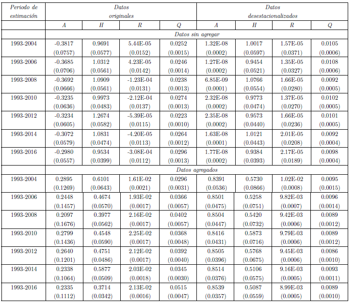 Para ello, lo que se hace es estimar hasta cierto periodo los parámetros A,H,Q y R mediante el modelo MFK una etapa, después se aproxima la tasa de crecimiento del PIB mensual para el periodo restante utilizando el filtro de Kalman y, finalmente, se construye el logaritmo del PIB mensual mediante las relaciones (1) y (2) para los datos sin agregar y datos agregados, respectivamente. Se consideran siete diferentes periodos para la estimación de dichos parámetros, el primer periodo abarca de marzo de 1993 a diciembre 2004, el segundo de marzo de 1993 a diciembre de 2005, y así sucesivamente hasta llegar al periodo de marzo de 1993 a diciembre de 2016. En el cuadro 4 se presentan las estimaciones de los parámetros A, H, Q y R involucrados en el modelo MFK una etapa, para los datos originales y desestacionalizados, así como estos agregados y sin agregar. Hay que destacar que los parámetros varían poco en los periodos analizados, 21 lo que significa que dichos parámetros han sido estables a través del tiempo. Este último hecho es muy importante al momento de hacer los pronósticos.