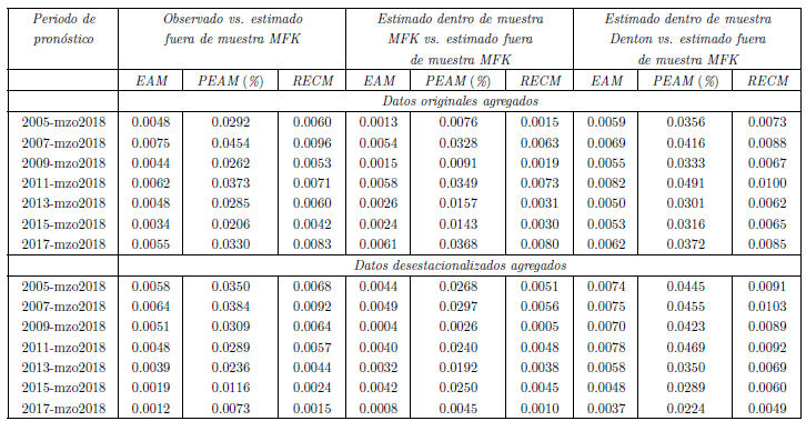 Para comparar los pronósticos del logaritmo del PIB mensual fuera de muestra con las aproximaciones dentro de muestra y con los datos observados, en el cuadro 5 se proporcionan los errores EAM, PEAM y RECM para diferentes periodos de estimación, considerando que los pronósticos fueron realizados con datos sin agregar. De dicho cuadro se puede concluir lo siguiente: con respecto al error PEAM, en general, se puede apreciar que es menor a 0.1% para los datos originales y menor a 0.06% para los datos desestacionalizados. Los errores estimados con datos desestacionalizados son menores que los errores calculados con datos originales, lo que significa que el modelo MFK fuera de muestra pronostica mejor el logaritmo del PIB mensual con los datos desestacionalizados. El único parámetro real de comparación son los datos trimestrales observados del logaritmo del PIB, y de esta comparación se desprende que los errores son pequeños, menores a 0.1%, para el caso del error PEAM. En el periodo de pronostico marzo 2009- marzo 2018 se observa que los errores se incrementaron tanto para datos originales como para los datos desestacionalizados. Es decir, los pronósticos del logaritmo del PIB mensual realizados con datos sin agregar en este periodo no capturan la fuerte caída que tuvo el PIB.