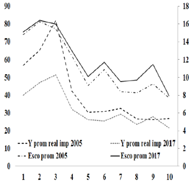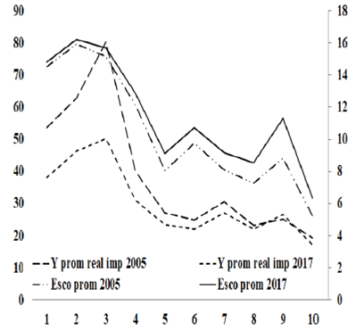 Lo anterior significa que una variación porcentual positiva en los extremos de la distribución genera un proceso de polarización bimodal en el sentido de Esteban, Gradin y Ray (1998), es decir, existe un crecimiento de los trabajos con menores destrezas y de bajos salarios, así como un crecimiento en los trabajos de altas destrezas con elevados salarios. Sin embargo, puede existir otro tipo de polarización, aquella que es sesgada hacia alguna de las colas. La situación más probable es la que aglutina a gran parte de la población ocupada en los deciles de ingreso más bajo y, por ello, en ocupaciones de bajas destrezas (Duclos, Esteban y Ray, 2004).