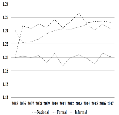 Lo anterior es probable que sea una característica derivada de la ausencia de leyes laborales, las cuales puedan amainar las amplificaciones de la brecha salarial entre grupos ocupacionales.18 La evidencia ha sugerido que los salarios de la parte baja de la distribución en el empleo informal son inferiores a los que se presentan en el empleo formal y que, en esta parte baja, se aglutinan un mayor porcentaje de asalariados, más de 57% de hombres y más de 72% de las mujeres. Lo que es evidente en el período en cuestión y que, probablemente, explique parte de este incremento de la polarización es la caída en la tasa de sindicalización para los tres grupos de destrezas, aunque la caída de la tasa de sindicalización más alta se ha dado en el grupo de más bajas destrezas, al pasar de 11.38% en 2005 a 6.45% en 2017. Para los grupos de destrezas medias y altas la tasa también declinó de 8.49% a 5.9% y de 13.68% a 11.01%, respectivamente. Por su parte, la tasa de sindicalización en el empleo informal es nada significativa, situándose, a lo sumo, en 1% en promedio y con una tendencia decreciente entre 2005 y 2017 para los tres niveles de destrezas.