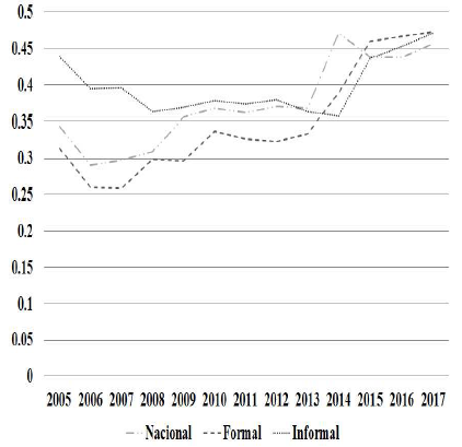 Hasta este momento hemos presentado una manera de distinguir la polarización en el mercado de trabajo mexicano. Los resultados nos han revelado una situación de polarización tanto a nivel nacional como en el empleo formal y, más profusamente, en el empleo informal. Cuando realizamos el cálculo de la polarización a través del índice de Duclos, Esteban y Ray (2004) , DER, podemos visualizar, más allá de la previa estática comparativa que hemos hecho entre 2005 y 2017, el comportamiento de la polarización salarial y ocupacional durante el período completo, tanto a nivel nacional como en el empleo formal e informal. La gráfica 13nos muestra la evolución del índice de polarización salarial DER, con un = 0.5. 17 Esta gráfica exhibe una tendencia ligeramente creciente del índice de polarización, tanto a nivel nacional como informal, no obstante, mantiene una relativa estabilidad en el ámbito formal. La tendencia ligeramente creciente en el ámbito nacional e informal se mantiene desde 2007 hasta 2016, de hecho, la crisis del 2008 tiene un sensible impacto en la polarización salarial del mercado informal, lo cual se refleja de forma más tenue en la polarización nacional debido a la relativa estabilidad de la polarización en el mercado formal. Dicha estabilidad bien puede ser debido a la relativa estabilidad del poder adquisitivo del salario mínimo en las dos últimas décadas, como bien lo ha sugerido Campos-Vázquez (2013a) .