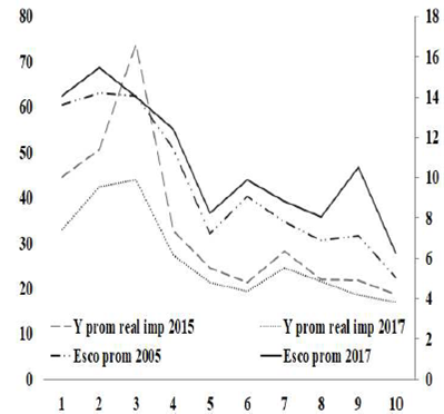 Asimismo, un hecho destacable que no hay que soslayar en las gráficas 1-3 es que los ingresos salariales reales promedio, tanto para profesionales, técnicos, trabajadores del arte, trabajadores de la educación, funcionarios y directivos, e inclusive oficinistas, han disminuido en términos relativos entre 2005 y 2017.10 Esta brecha se va reduciendo en la medida que nos vamos desplazando a categorías ocupacionales con menores años de escolaridad. Lo que, probablemente, se explica por la creciente oferta relativa de trabajadores más educados que se ha venido desarrollando en los últimos años en México. Esta oferta creciente está estrechamente ligada a asalariados con educación media y superior, lo que ha generado una caída en los salarios promedio, así como en los salarios relativos de dichos segmentos educativos (Esquivel y Rodríguez, 2003; Campos-Vázquez, 2013a). Ahora bien, cuando observamos la brecha en años de escolaridad entre 2005 y 2017, tanto para hombres como para mujeres, tenemos que en 2005 la brecha promedio entre mujeres más educadas y menos educadas era de 10.29 años de escolaridad, para 2017 la brecha bajó 9.035 años promedio. Con respecto a los hombres, dicha brecha pasó de 7.76 años a 9.36 años promedio entre los dos años (gráficas 1-3).11 La brecha es más significativa en el caso de los hombres, casi un incremento de dos años promedio, de igual manera los cambios en la brecha se dan en sentidos contrarios; parecería que, debido a que en los últimos años las mujeres han aumentado sus años de escolaridad promedio en general, en lo bajo de la distribución educacional ellas han incrementado aún más sus años de escolaridad promedio, con lo que disminuye así la brecha.12