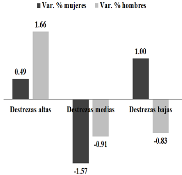 En la misma gráfica observamos que las mayores variaciones positivas en el empleo formal ahora se presentan en los segmentos de destrezas altas y medias, a saber, 1.48% y 0.06%, respectivamente. Sin embargo, la variación para destrezas bajas es negativa del orden de -1.54 por ciento. Situación que aún sigue reflejando cierta polarización sesgada hacia el perfil de destrezas más altas. Asimismo, en lo relativo al comportamiento del empleo informal según el nivel de destrezas. Resulta bastante notorio como se presenta una variación negativa del orden de -2.81% en las destrezas medias, por su parte, tanto las destrezas altas como las bajas reflejan una variación porcentual positiva de 1.13% y 1.68%, respectivamente. Esto, sin duda, refleja un claro comportamiento de polarización bimodal en el empleo informal.