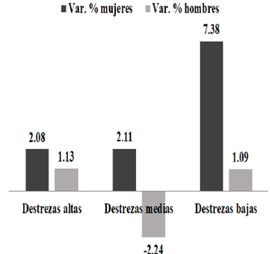 Cuando realizamos el análisis por género podemos observar hechos relevantes. La gráfica 5 nos muestra las variaciones porcentuales de la población asalariada femenina y masculina entre 2005 y 2017. Lo que se revela cuando descomponemos por género es que existe una variación porcentual positiva del orden de 1% a nivel nacional para los trabajos de más bajas destrezas que ocupan las mujeres. Los trabajos de destrezas medias para ambos sexos tienen variaciones negativas, lo destacable aquí es que el empleo femenino es el que sufre un mayor deterioro, -1.57% de variación. Esta situación refleja un fenómeno de deterioro en dos vías: la caída del empleo femenino de salarios medios y el incremento, aunque pequeño, del empleo femenino con más bajos salarios, lo que probablemente expresaría una ampliación en la brecha salarial entre hombres y mujeres entre 2005 y 2017.