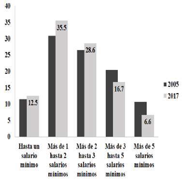 Fuente: Elaboración propia con microdatos de la ENOE, 2005 y 2017. Los datos incluyen al conjunto de asalariados entre 15 y 98 años de edad, se dividen en tres grupos ocupacionales consistentes con un nivel de salario promedio (bajo, medio y alto), con base en la metodología de Goos y Manning (2003) y Autor (2010).