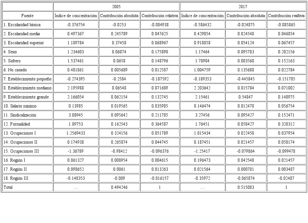 Asimismo, los resultados sugieren que la composición del mercado de trabajo, a saber, su fragmentación entre empleo formal e informal es una de las principales causas del proceso de polarización salarial en México. Del mismo modo, la característica de género ha tenido gran peso a la hora de explicar las fuentes de la polarización del ingreso salarial. Adicionalmente, un efecto semejante ha provocado el empleo en establecimientos más grandes. Esto podría ser una condición, incluso natural, propiciada por la configuración industrial, pero exacerbada por condicionamientos tanto institucionales como tecnológicos que tienen presencia en nuestro país. Del mismo modo, la aglutinación asimétrica en la distribución salarial entre hombres y mujeres que está íntimamente ligada al tipo de ocupación que se realiza, especialmente en el empleo informal, ha contribuido al proceso de polarización en perjuicio de éstas últimas.