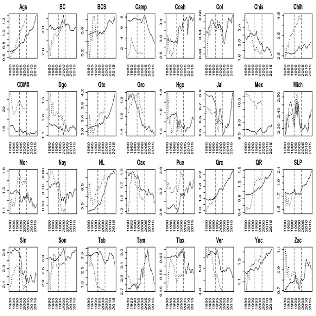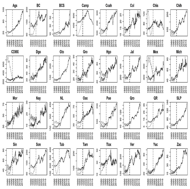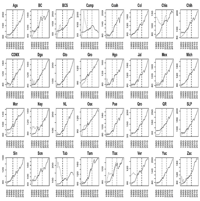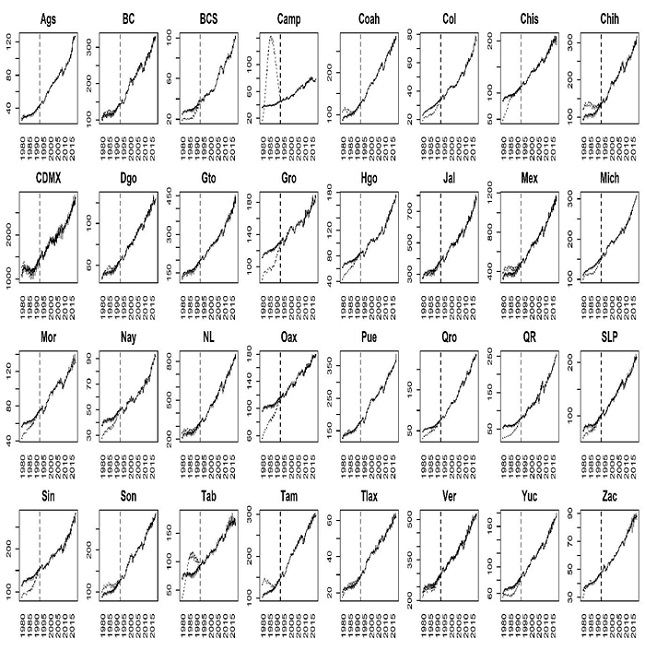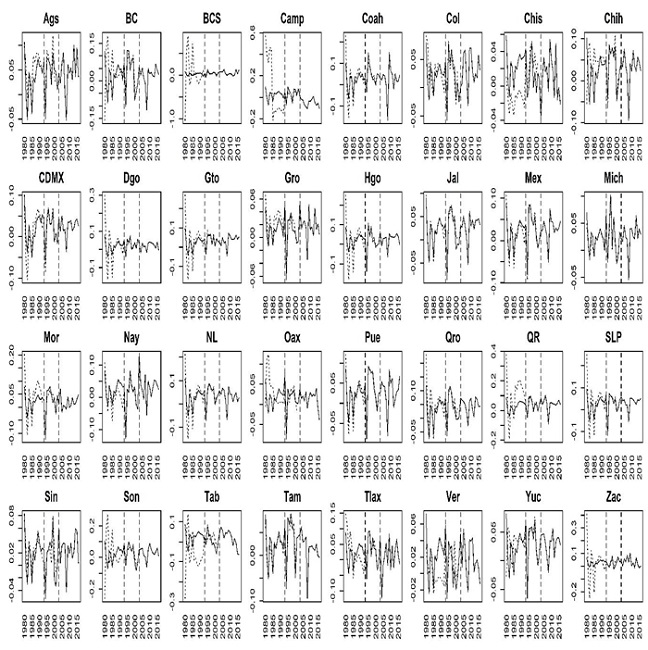 Se puede ver que sólo en Aguascalientes y Veracruz coincide una fecha de corte con un posible cambio estructural, en este caso el año 2003. No obstante, al ser dicho periodo parte de la retropolación donde se usa información estatal, se considera como no crítica dicha coincidencia. Estos resultados permiten corroborar que, el procedimiento de retropolación que sólo incorpora información nacional como restricciones contemporáneas para el periodo 1980:I:1992:IV, no introduce choques externos que puedan ser interpretados como cambios estructurales, es decir, que influyen en el comportamiento de largo plazo de las series de tiempo. Es importante notar que durante 1992:IV-1993:I no se tiene conocimiento de la existencia de acontecimientos económicos importantes que indiquen la posible presencia de cambios estructurales, situación que sí ocurre, por ejemplo, en los años 1982, 1995 y 2009.