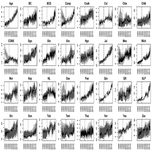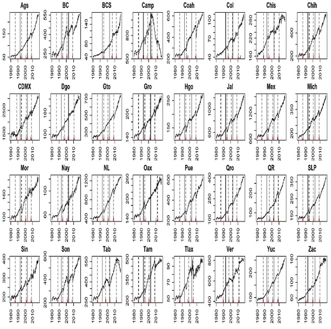 Por otro lado, resulta válida la idea de que, al realizar la retropolación con mayor cantidad de información en un periodo que en otro, pueden introducirse cambios estructurales aludidos al procedimiento. Por tal motivo, se realiza un conjunto de pruebas de cambios estructurales para el total estatal2 usando el procedimiento de Verbesselt et al. (2010). Dicha metodología se basa en los trabajos de Bai y Perron (2003) y de Zeileis et al. (2003) para detectar la posición óptima de los puntos de quiebre -cambio de tendencia, de nivel o de factores estacionales- que, además, permite identificar el número óptimo de estos puntos minimizando un criterio de información. Los métodos en cuestión han sido comúnmente utilizados en el análisis de series de tiempo de imágenes satelitales para identificar cambios significativos derivados de las variaciones climáticas estacionales.