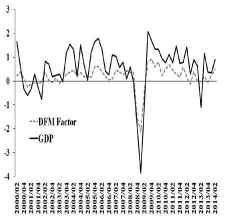To deal with the jagged edges problem, I elaborate ARIMA models for each monthly variable, in order to forecast the missing observations at the end of the series. In this way, to generate the quarterly GDP growth forecast,8 the BE, the DFM and the PCA models are estimated from previously completed information sets with ARIMA equations. This allows me to compare the predictive power of each model regardless of how it deals with incomplete information sets. All this despite the fact that both the PCA and the DFM models could make forecasts of their own factors. It is important to mention that all results from this section were obtained with GDP data published until 2014-II, except those of subsection 5.6, which were conducted in real time (from 2014-II to 2017-I).
