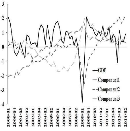 Consequently, and analogously to the methods described above, in the PCA approach, I use the k quarterly principal components (figures 2 and 3) as regressors in the following linear equation to forecast quarterly GDP growth: