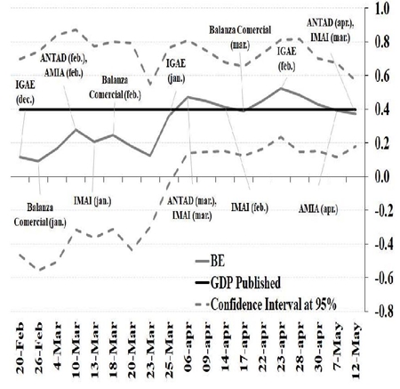In addition, I provide an analysis for predictions in real time. This was possible because I recorded the nowcasts for twelve consecutive quarters (from 2014-II to 2017-I) as new information was incorporated in each model. From this tracking I obtained the forecast errors from BE model average. My results show that the error variance declines as more information is released from the reference quarter. I also find that the model I propose in this research can offer an accurate GDP forecast a month before INEGI publishes the official National Account GDP and a week before it publishes its timely GDP estimate. Indeed, once the IGAE data for the second month of the reference quarter are included in the information set, the forecast is, on average, equal to the observed quarterly GDP variation, and 75 percent of the time the margin of error is, in absolute terms, less than 0.1 percentage points of the aforementioned quarterly variation.