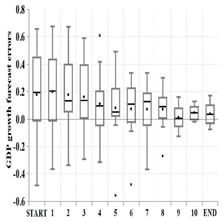 I recorded my GDP growth forecasts during twelve quarters, and from these forecasts I obtained the forecast errors that were grouped by “moments”. I identified 12 moments of particular relevance that make up the real-time GDP forecast evolution for any quarter. These moments include indicators of interest that have important effects on nowcasting: