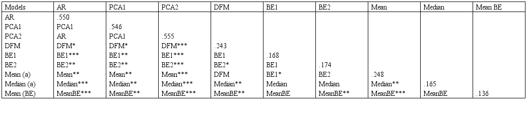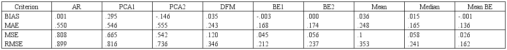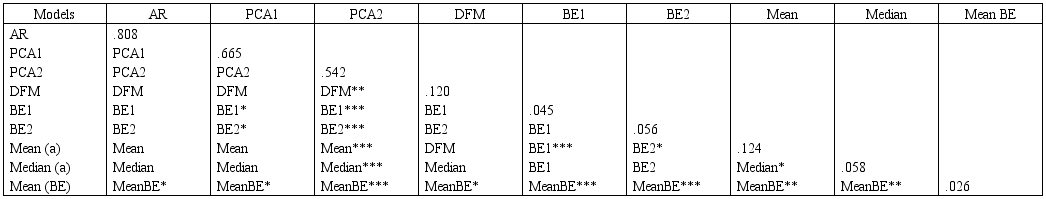 Furthermore, I also performed the modified DM tests on a smaller sample, one which excludes the period of the 2008-2009 financial crisis. Thus, I evaluate the forecasts from 2011-I until the end of the sample (see appendix A5, table A.4). The results favor the average of BE over any other model, with statistically significant differences (except when compared with the BE1 model, where my result is not conclusive). Again, the DFM offers more accurate forecasts than the AR and the PCA models, but the BE models produce more accurate forecasts than the former.