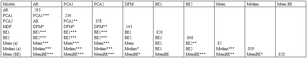 In order to evaluate the predictive power of each model and thus discern which is more appropriate to perform nowcasting, I use the modified Diebold-Mariano (DM) test proposed by Harvey, Leybourne, and Newbold (1997), hereafter referred to as the HLN-modified DM test, for small samples.11Table 4 summarizes this test comparing each model with the rest. In the main diagonal, the mean square error (MSE) of each model is indicated in bold and the columns show which model is more accurate, according to this test. I indicate the statistical significance of error differences in each pair of compared models with asterisks. The test considers the quarters that go from 2009-I to 2016-II, the financial crisis of 2009 is included.