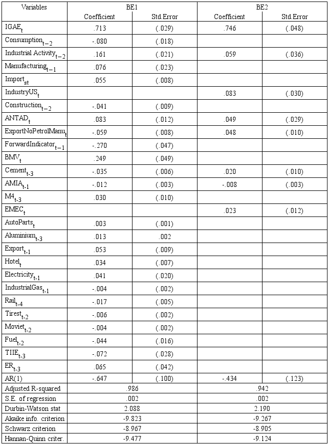 Note that, during the nowcast of the previous section, the BE models were updated according to the data revisions as well as the seasonal adjustments. This means that models are changing as needed. As an example, in table 1 I show the model estimation for the BE models with data available until July 2017, which is the latest available model from estimations made in real time (The autocorrelation analysis and the normality test are shown in appendix A3.1). Table 1 also shows how some variables could lose their significant levels (see ERt−3 , Industrial Activityt−2, ANTADt , and EMECt in table 1) due to data revisions and due to changes in the seasonally adjustment models, but I included those variables nevertheless, in order to keep track of them and to have comparable forecast among quarters, despite data revisions.