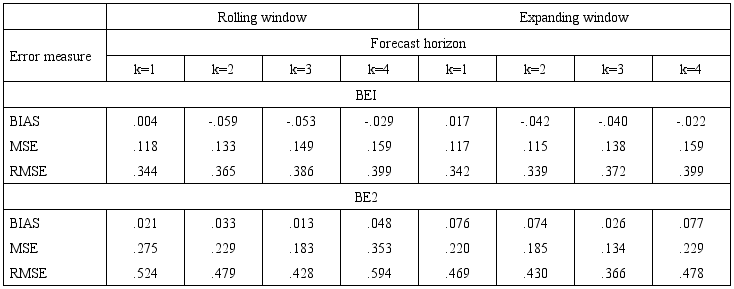 Results of rolling window analysis show that the forecast errors generated with BE1 show an ascending behavior as k grows. That is, errors become larger when the forecast horizon is longer. However, this is not true for the BE2 model, where the smallest error was obtained by forecasting three forward periods. Similarly, the expanded window does not show an increase in the forecast error in any of the models (table 6).