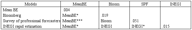To carry out the comparison I used the HLN-modified DM test for small samples. The results of this test show that the BE model’s MSE is lower than that of Bloomberg’s forecasts, as well as the SPF’s and the rapid GDP estimations released by INEGI, with statistically significant differences. The BE model’s MSE, 0.004, indicates that during the analysis in real time, GDP growth forecast has differed, on average, 5 hundredths of the seasonally adjusted quarterly GDP variation observed (table 8), which means it offers a timely and relatively precise forecast of Mexican GDP growth rate.