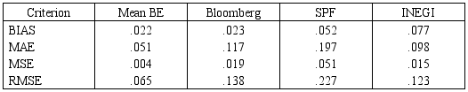 In my research I evaluate the BE model forecasts in real time, which has never been done before. This evaluation was possible because I kept a record of the forecasts of all the proposed models during 12 consecutive quarters (from the second quarter of 2014, henceforth 2014-II, to the first quarter of 2017, henceforth 2017-I). Based on these records and using the Diebold-Mariano test, I find that the BE models generate more accurate predictions than the median forecasts of the analysts surveyed by Bloomberg, the median of the forecasts provided by the specialists who answer the SPF and the rapid GDP estimate released by INEGI.