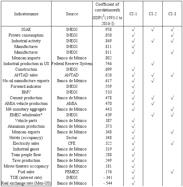 In this paper, I use quarterly series of Mexico’s GDP at constant prices, from the first quarter of 1993 (1993-I) to the first quarter of 2017 (2017-I). I consider three information sets as explanatory variables. The first one (CI-1) includes 25 monthly indicators that, when converted to quarterly indicators as explained above, have a correlation with GDP greater than 0.30 (this correlation is calculated with respect to the quarterly variations of seasonally adjusted series). However, if the indicator is published in the first week after the reference month, I keep it in the information set, even if correlation is less than 0.30. An additional criterion is that I only use monthly series that are available since 1993, in order to have explanatory variables whose observation period corresponds that of the Mexican GDP figures.
