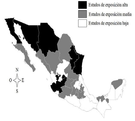 Cabe señalar que de los siete estados clasificados como de exposición alta, cinco comparten frontera con Estados Unidos, mientras que cinco de los diez estados que se encuentran clasificados como de exposición baja se ubican en el sur de México. Aun así, el criterio geográfico rinde resultados sobre convergencia diametralmente diferentes a los de esta clasificación (inferido a partir de ensayos que probaron la hipótesis geográfica).