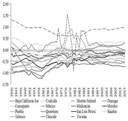 Durante 1940-2015 las regiones de México exhibieron convergencia, como saldo neto, aunque con una tendencia a frenarse. Este resultado coincide con el obtenido desde trabajos previos. Por ejemplo, mediante el análisis de las propiedades estocásticas de las series de PIB per cápita, Carrion-i-Silvestre y German-Soto (2007, 2009 y 2010) demostraron que es necesario considerar el cambio estructural ocurrido alrededor de los años ochenta para concluir que ha habido convergencia regional, de otra manera el proceso señala que no se ha convergido, pero esto es debido al sesgo originado a partir del cambio en la tendencia. Otros trabajos han llegado a conclusiones similares (German-Soto y Salazar, 2016; Rodríguez, Mendoza y Venegas, 2016). En el contexto del análisis β-convergencia, también hay similitud en la dirección de los hallazgos reportados por Cermeño (2001), Ayala, Chapa y Murguía (2011) y Díaz et al. (2017), entre otros.