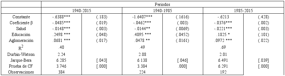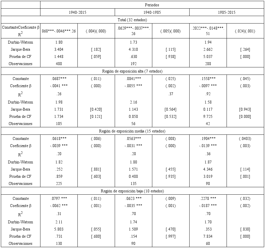 Estimaciones de la ecuación (1) se realizan a partir del método de mínimos cuadrados ponderados factibles, se asume la presencia de heteroscedasticidad del tipo corte transversal. La posible presencia de correlación serial se controla con el procedimiento Cochrane-Orcutt, mientras que también se somete a prueba la especificación que incluye efectos fijos. Los resultados de regresión con β-convergencia absoluta para el periodo global (1940-2015), las regresiones por etapa (1940-1985 y 1985-2015) y las distintas muestras analizadas se reportan en el cuadro 1. Allí se destaca que, en general, las velocidades de convergencia estimadas son muy pequeñas, menores a 1%, aunque relativamente más elevadas para el periodo de economía abierta, especialmente entre los 32 estados y en las regiones de exposición media y baja. El coeficiente β se recupera a partir de la ecuación: