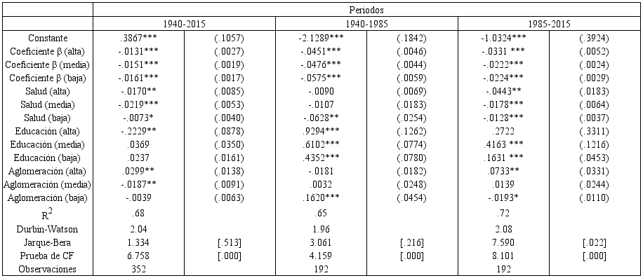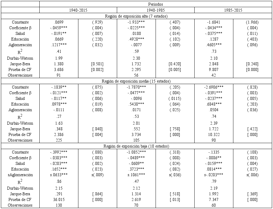 Del cuadro 4 se infiere que las velocidades de convergencia entre las tres regiones son estadísticamente diferentes, por lo que ahora es factible hablar de desigualdades entre las dos etapas de desarrollo, mientras que la magnitud de los coeficientes estimados informa sobre el grado de acentuación. Por ejemplo, la región de más baja exposición a la globalización exhibió la tasa de convergencia más alta, en relación con las demás regiones, durante el periodo de economía cerrada (1940-1985). Sin embargo, en la etapa de economía abierta registró la tasa más pequeña (y muy similar a la de la exposición media), mientras que la de exposición alta tuvo mayor diferencia. Además, las variables control fueron significativas en gran parte de los casos. La educación se aprecia relevante, principalmente en la primera etapa, en tanto que la medida de aglomeración resultó importante en la muestra de estados de mayor exposición a la globalización. Al ser también el grupo de economías con mayor velocidad de convergencia en la etapa reciente es posible inferir, entonces, la importancia de la conexión aglomeración-convergencia. Los avances en el ámbito de la salud también fueron sustanciales para el crecimiento de las tres regiones en la etapa más reciente.