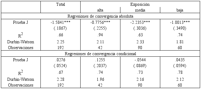 La estructura de panel utilizada aquí reduce la influencia del ciclo económico, por lo que se obtienen estimaciones más precisas (Islam, 1995), además de que también influye la corrección por heteroscedasticidad. Los estados más relacionados con el exterior han mejorado la velocidad de la convergencia, mientras que se ha frenado en los menos expuestos.