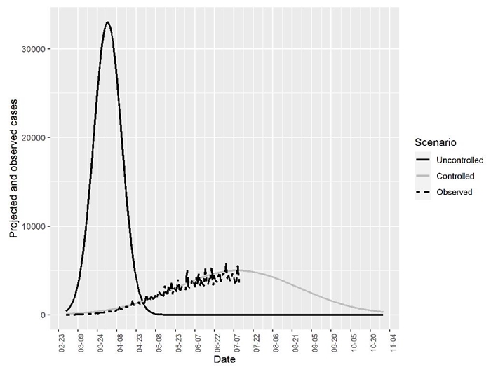 =47.55. In figure 2, I show the computed distributions of cases under the uncontrolled and controlled scenarios, together with the observed number of cases from the Health Secretary. The projected number of cases with mitigation closely follows the trajectory of the actual data.