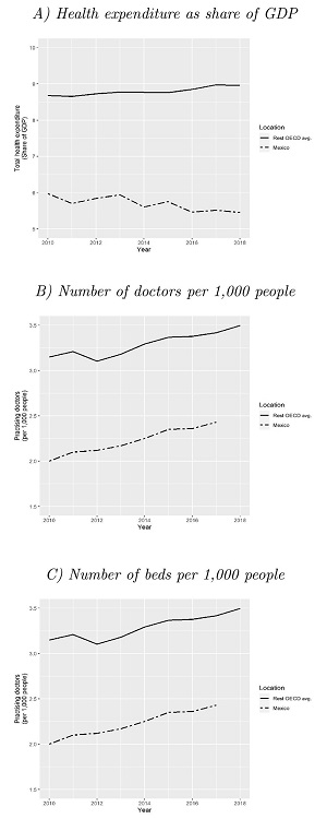 The COVID-19 epidemic highlighted the structural deficiencies of the Mexican healthcare system. Over the last 10 years, the total expenditure on health in the economy has remained about constant and represents only 60% of the average expenditure in the OECD countries. During the same period, the stock of resources in per capita terms has also remained almost unchanged. Figure 3 presents three indicators that contextualize the difference in the amount of healthcare resources that can be made available in Mexico during the epidemic.