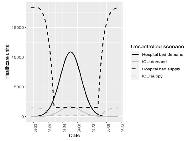 Using my estimates on the daily supply of hospital beds and ICUs, together with the projected demand for hospitalization and critical care, I estimate the excess demand that would have occurred in the uncontrolled scenario and the date of this happening. Figure 4 represents this allocation problem. The dashed lines show the amount of resources available at every moment, while the solid curves are the estimated demand derived in section 4. At the beginning of the epidemic, the system can provide care according to the total hospital bed and ICU availability (18,402 and 1,450 units, respectively). As the infection progresses, demand grows fast exhausting medical resources as they reach the surge capacity. As is evident from figure 4, the number of patients requiring a hospital bed or an ICU would have exceeded the supply as early as by the second week of March. By the time of the projected peak date (April 1st), the system would have required almost 11,000 hospital beds and 1,600 ICUs every day.